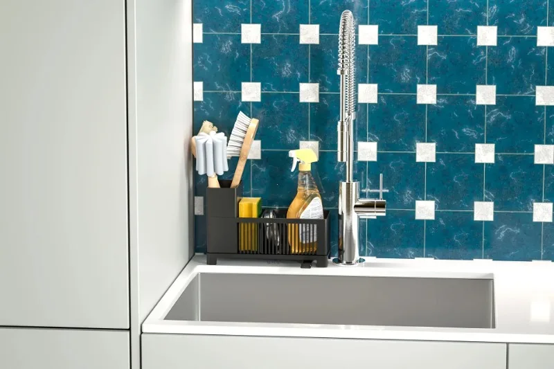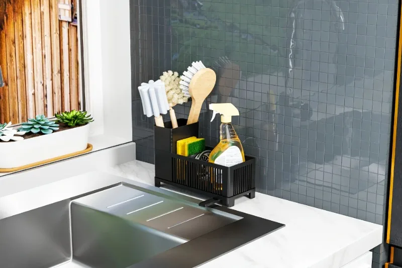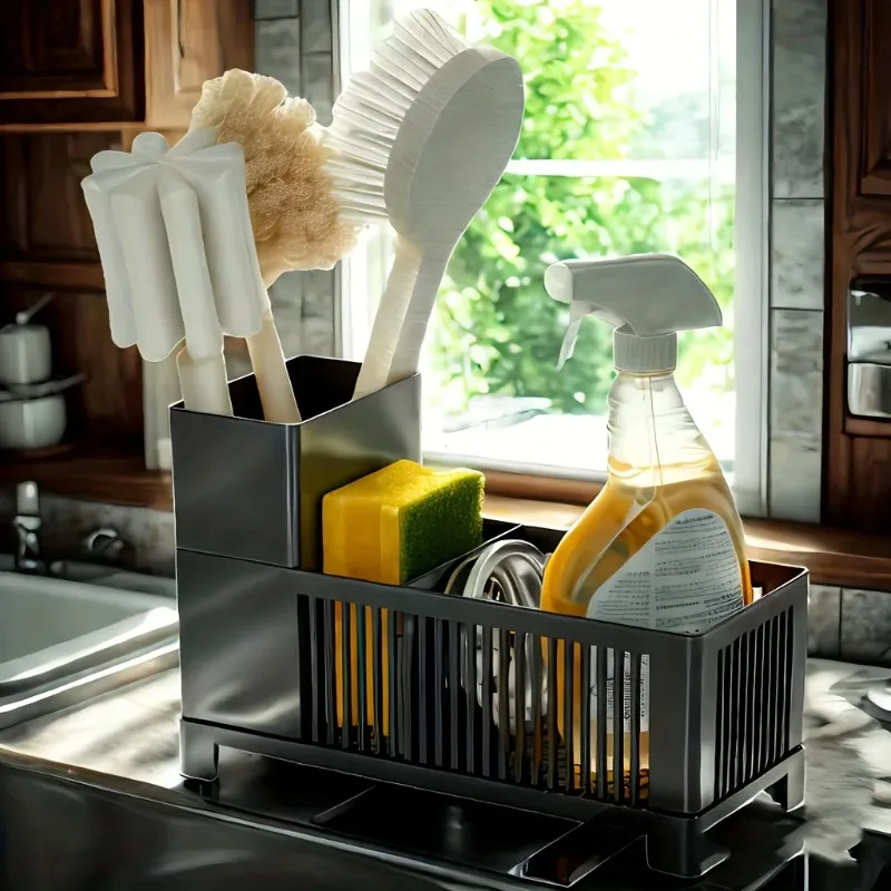 【Multipurpose】: The kitchen sink organizer is Great for holding sponges, soap dispensers, brushes, sink plug, dish soap, hand soap bottles, rags, and more