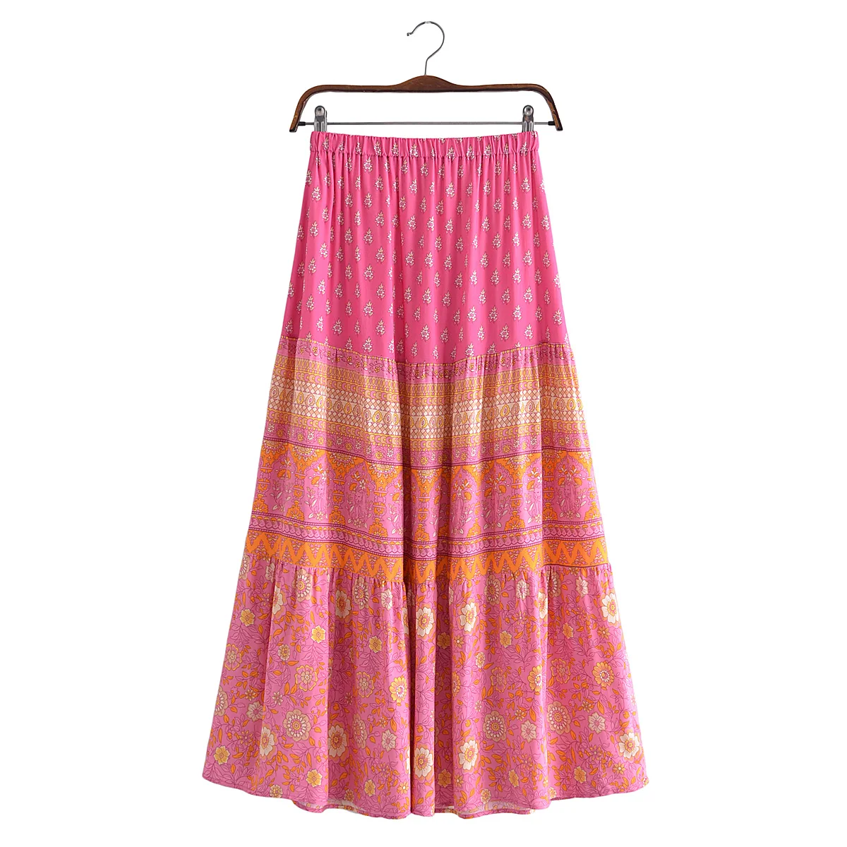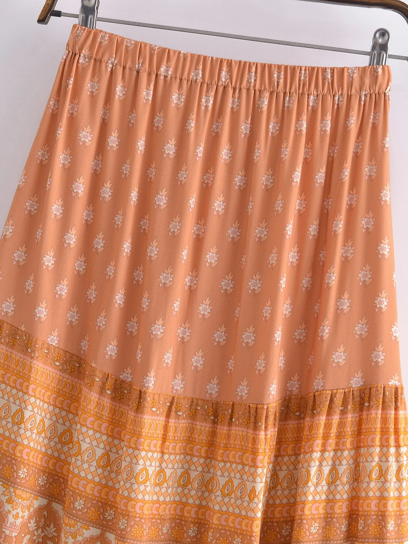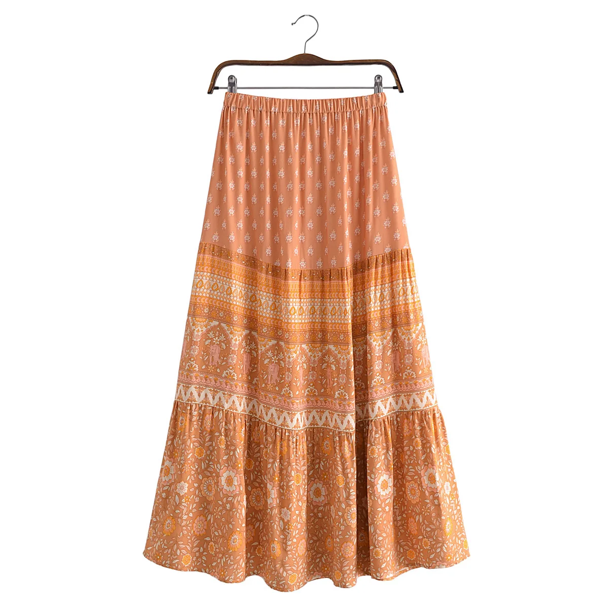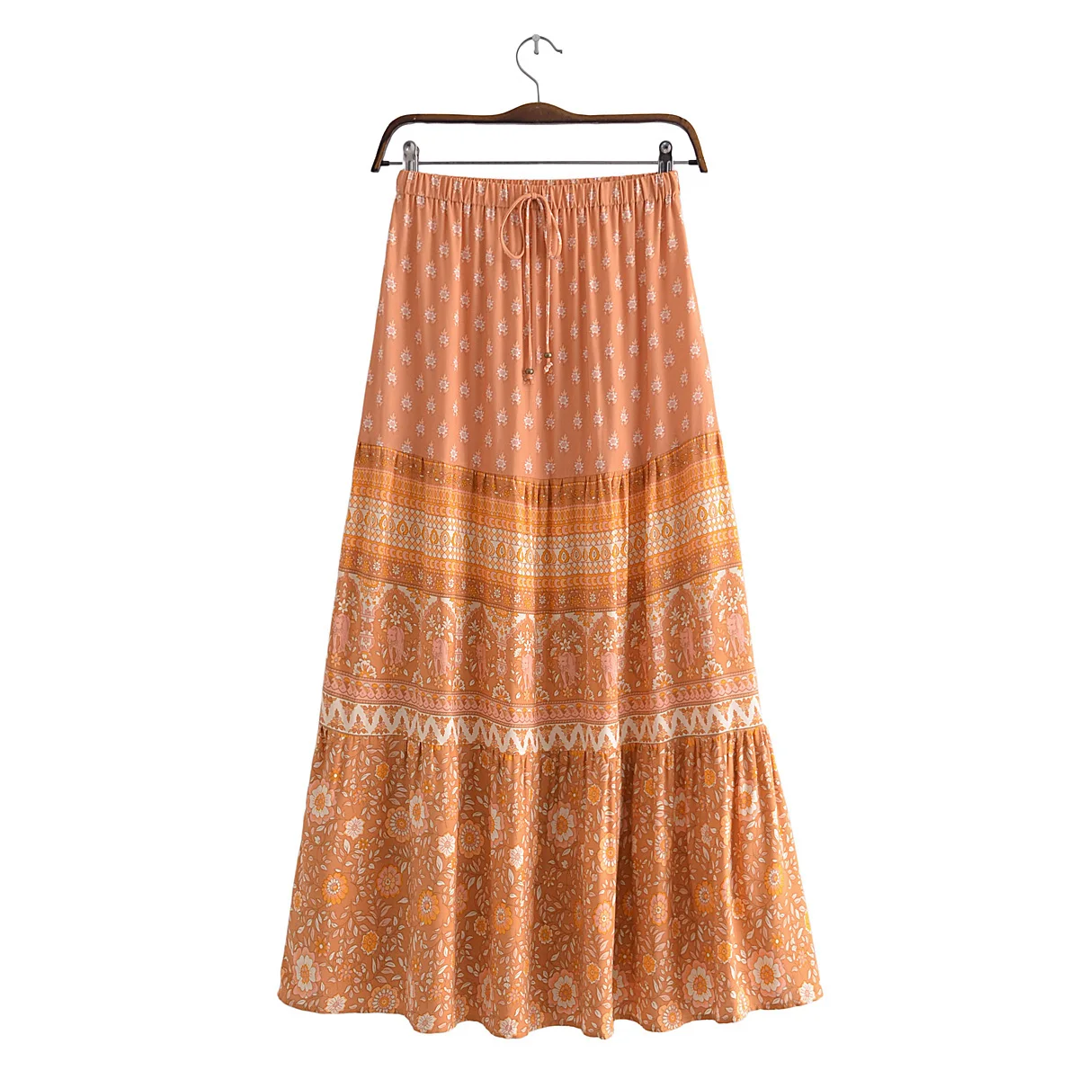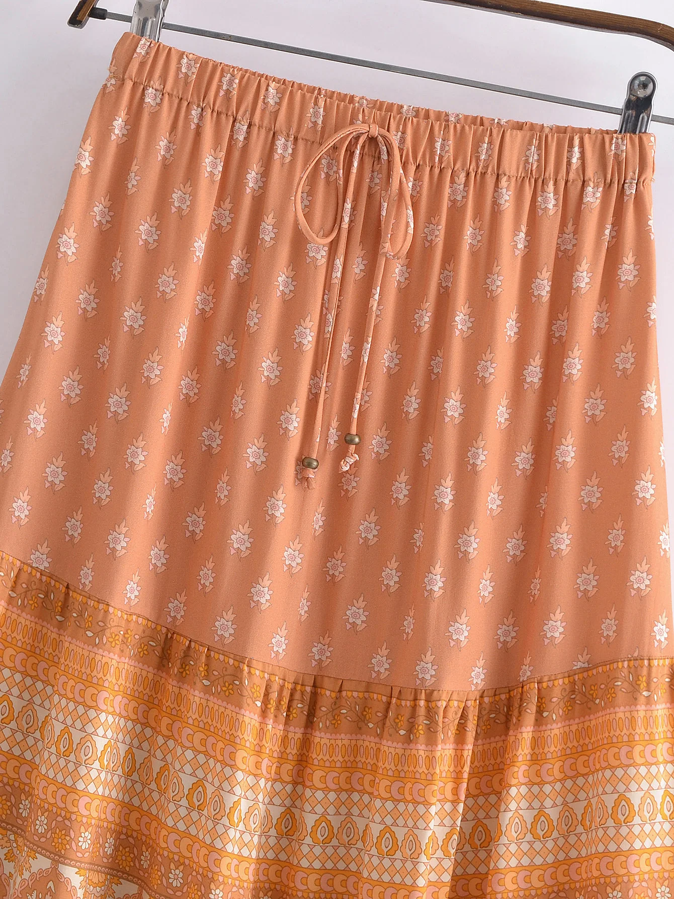 2022 BOHO Orange Flower Print Long Skirt Spliced Ruched Ruffle Hem Hippie Women Ball Tassel Bow Waist Swing Skirts Holiday