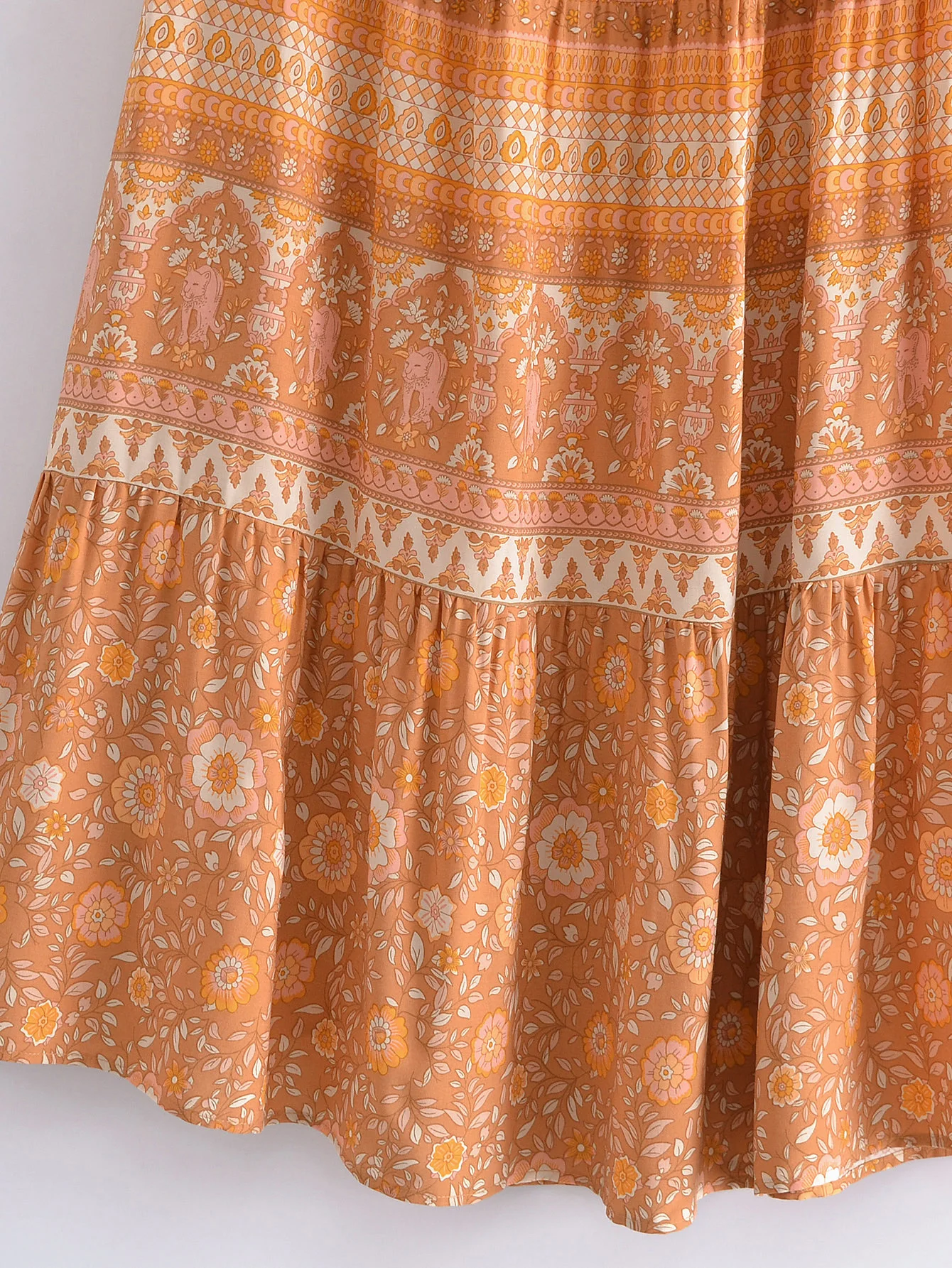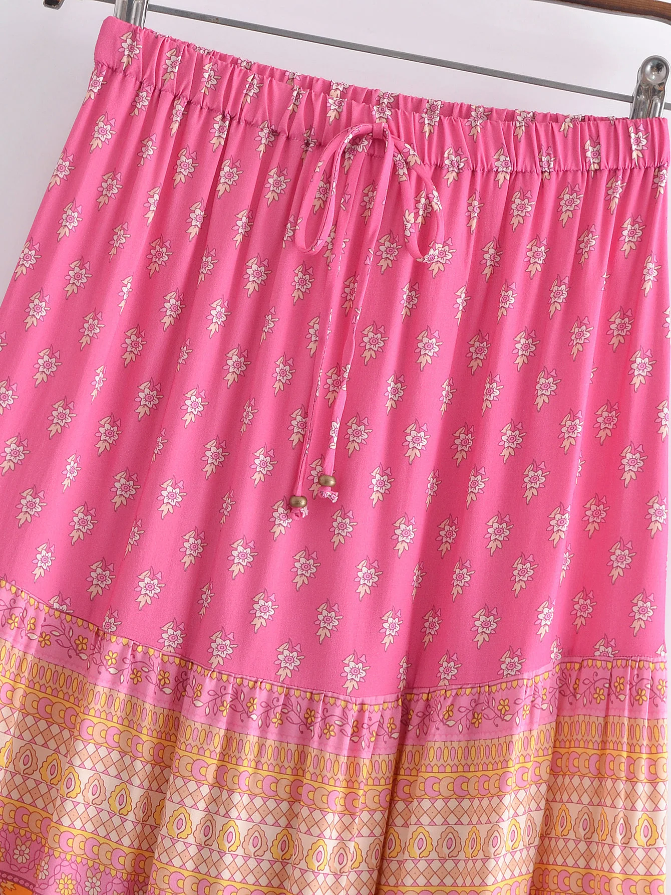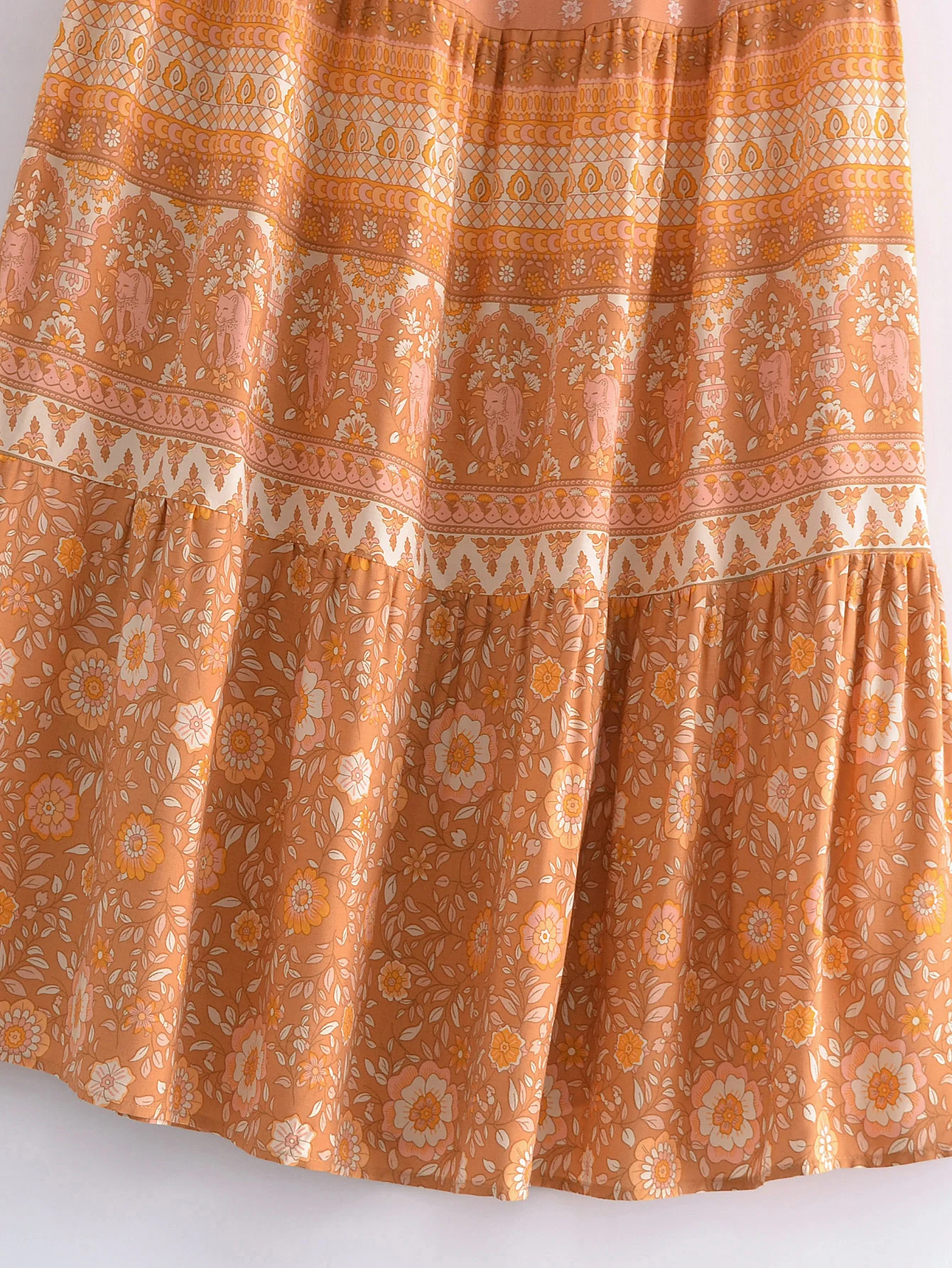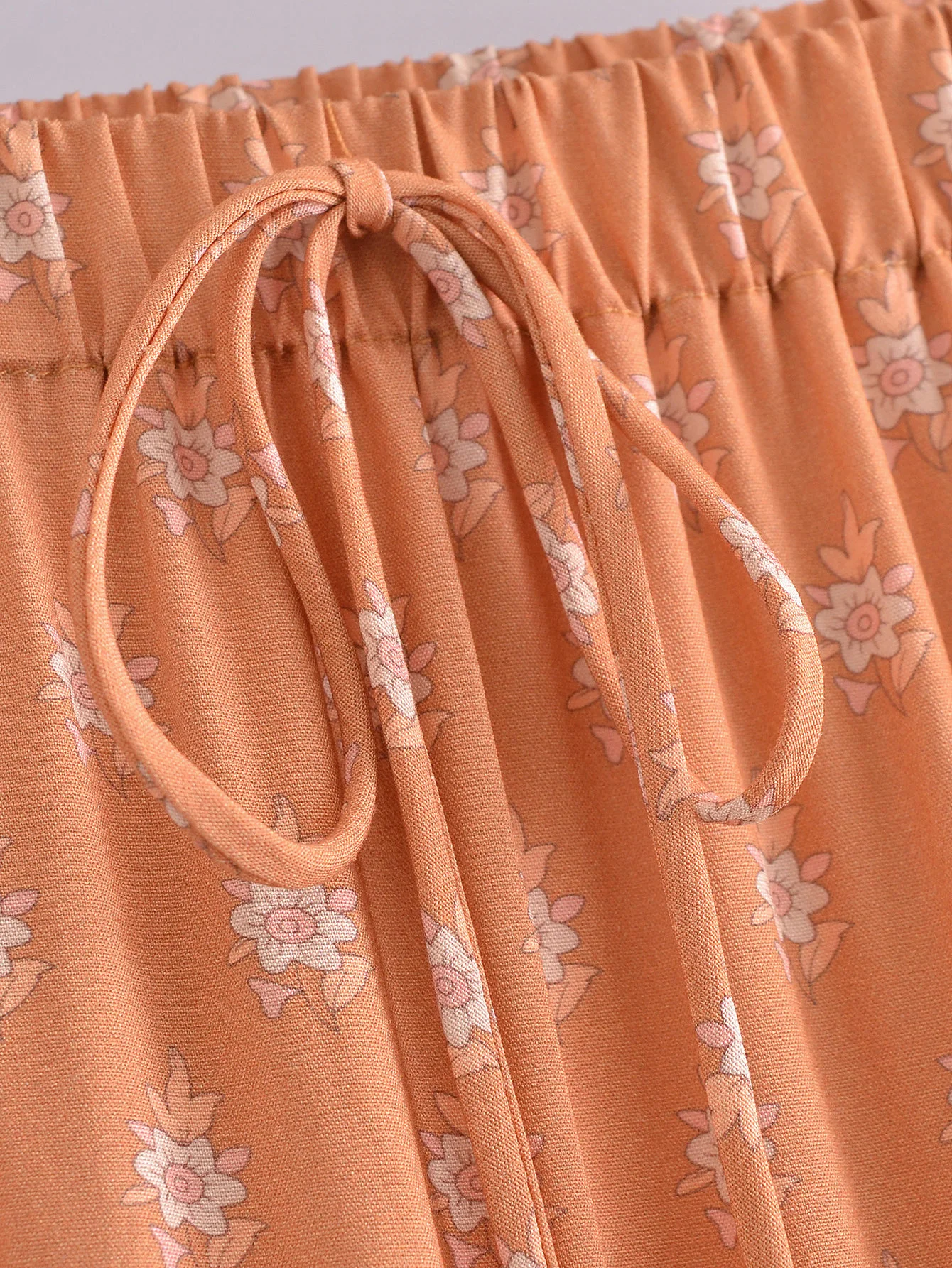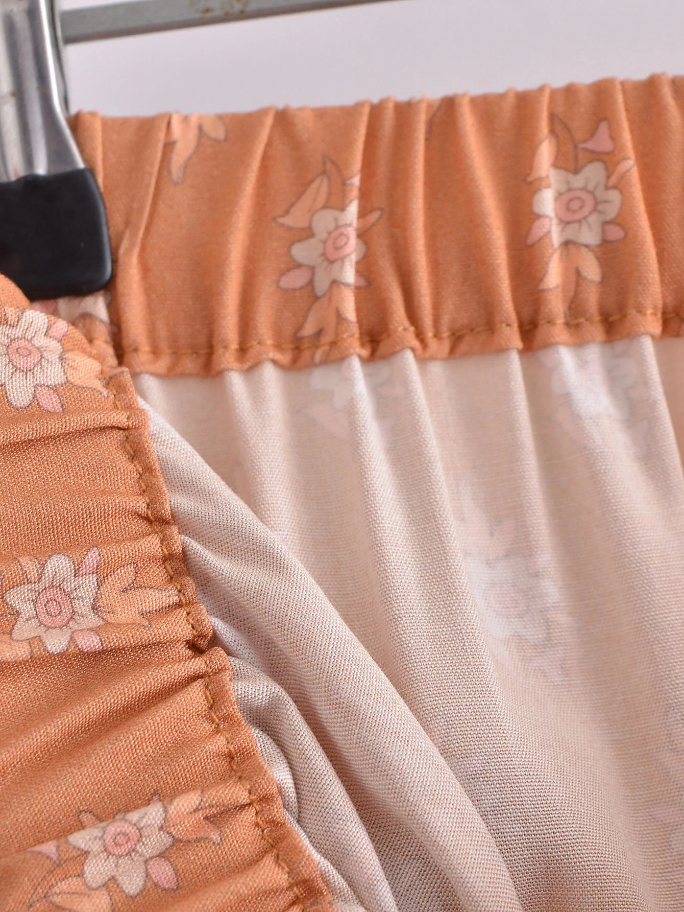 2022 BOHO Orange Flower Print Long Skirt Spliced Ruched Ruffle Hem Hippie Women Ball Tassel Bow Waist Swing Skirts Holiday