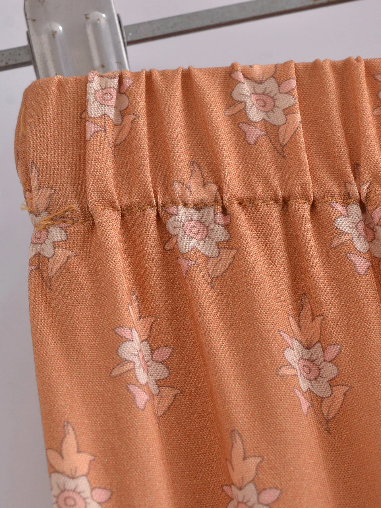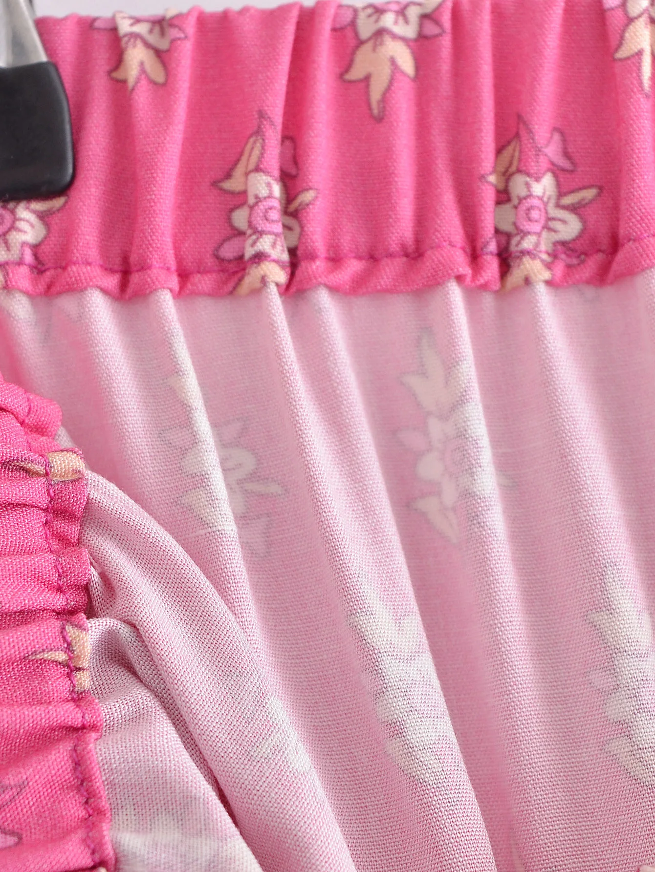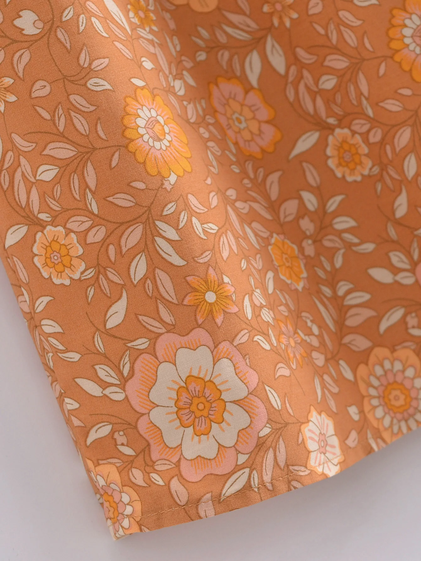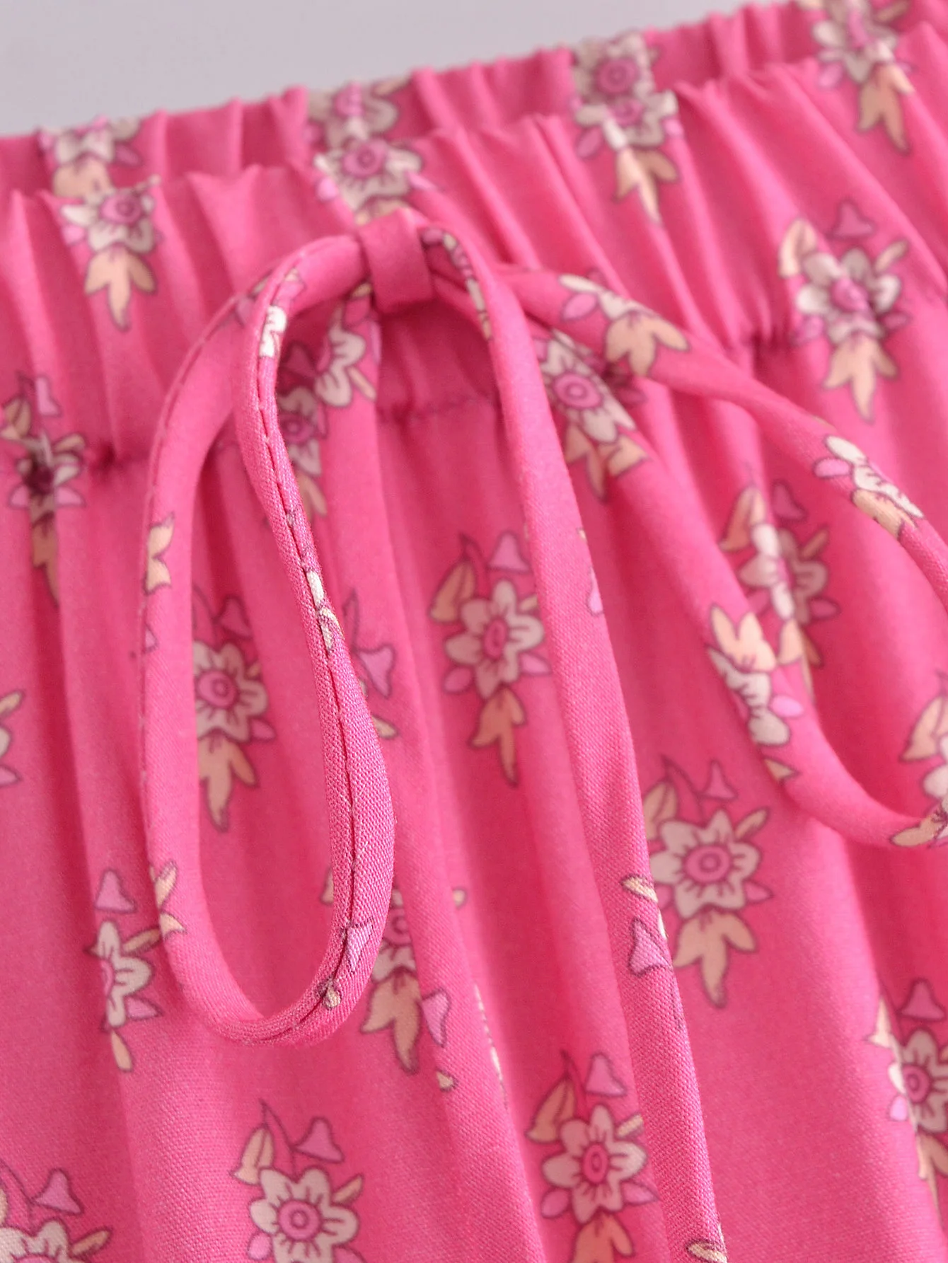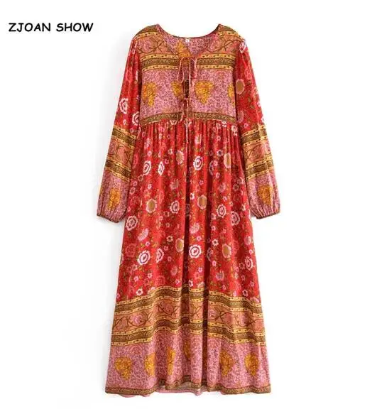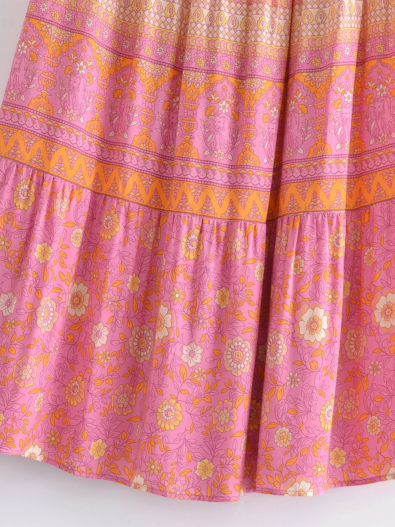 2022 BOHO Orange Flower Print Long Skirt Spliced Ruched Ruffle Hem Hippie Women Ball Tassel Bow Waist Swing Skirts Holiday