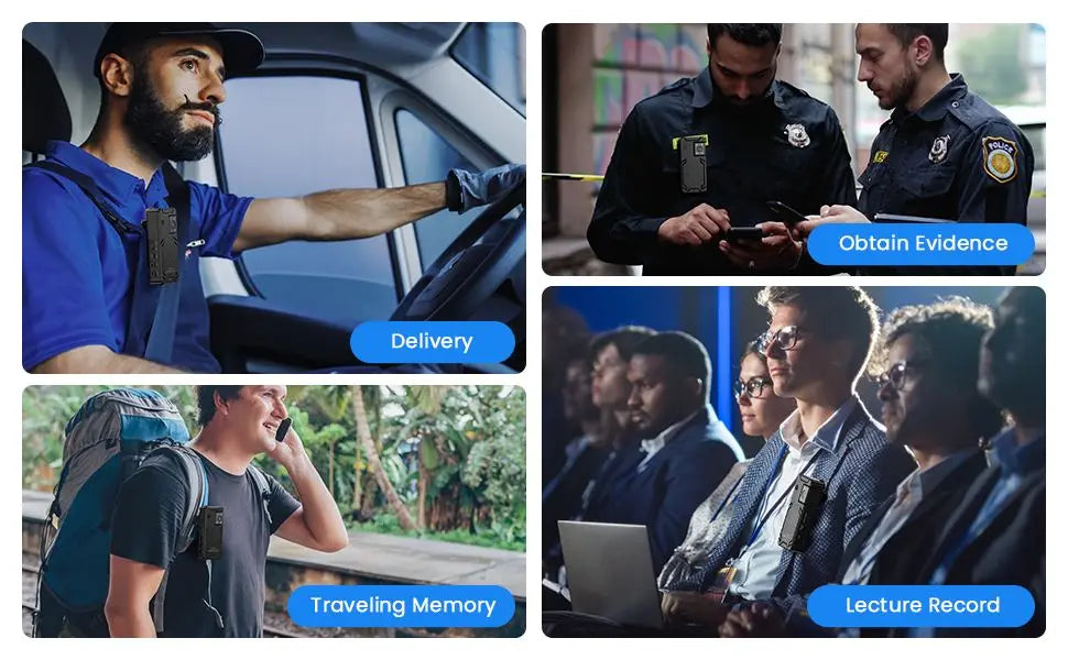 【1296P HD Videos Resolution with Powerful IR Night Vision 】 A24 body worn camera with 160° wide angle captures 1296P HD videos and 40MP photos; Meanwhile, it is equipped with High-Intensity infrared LEDs, and can capture clear footage up to 10m/32ft feet away in pitch-black darkness.