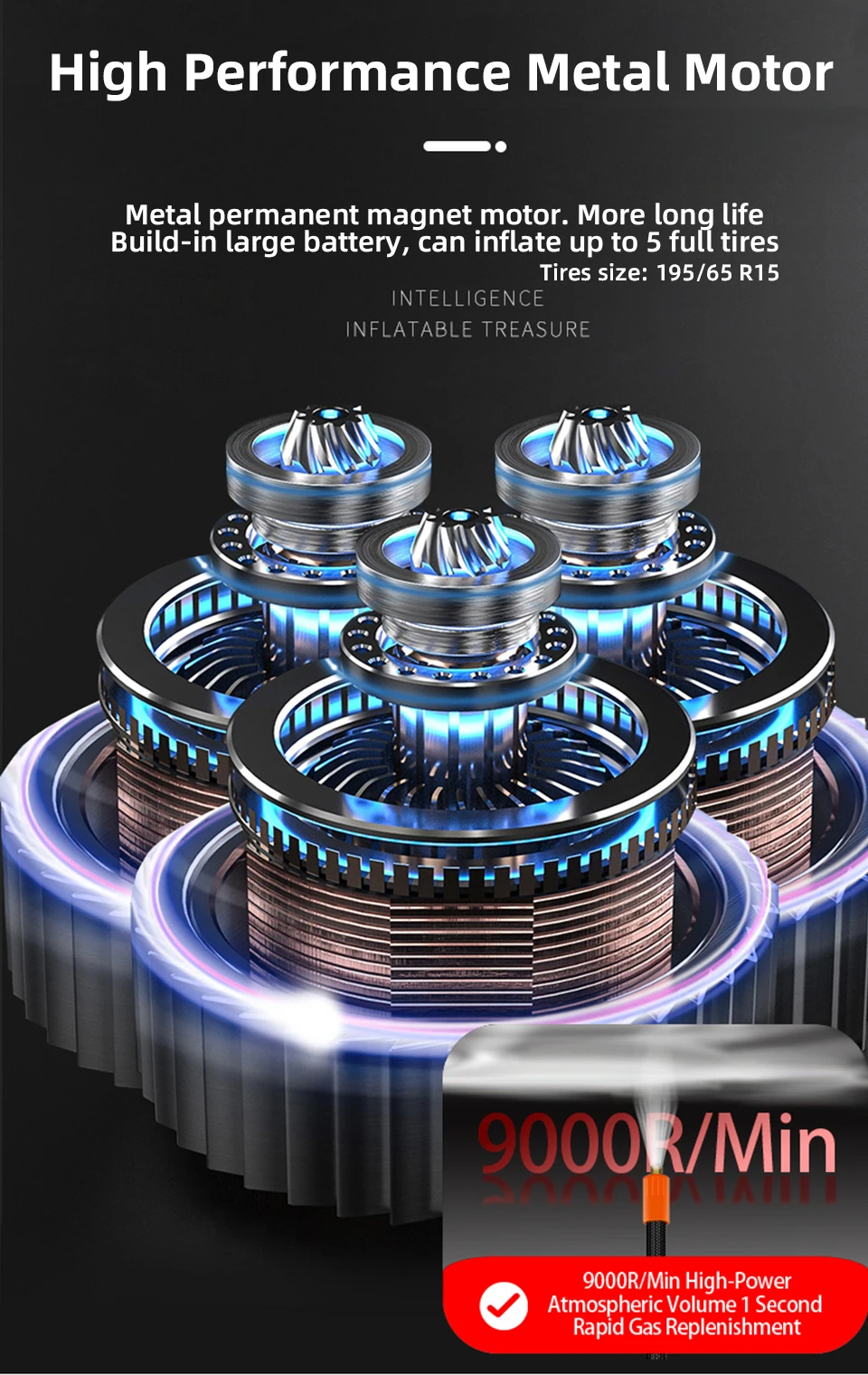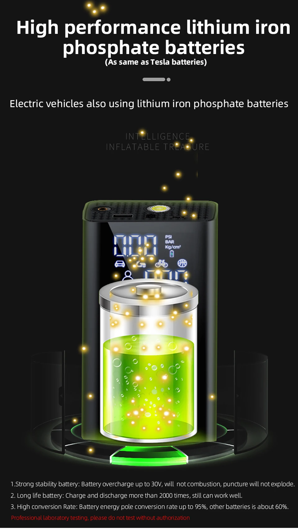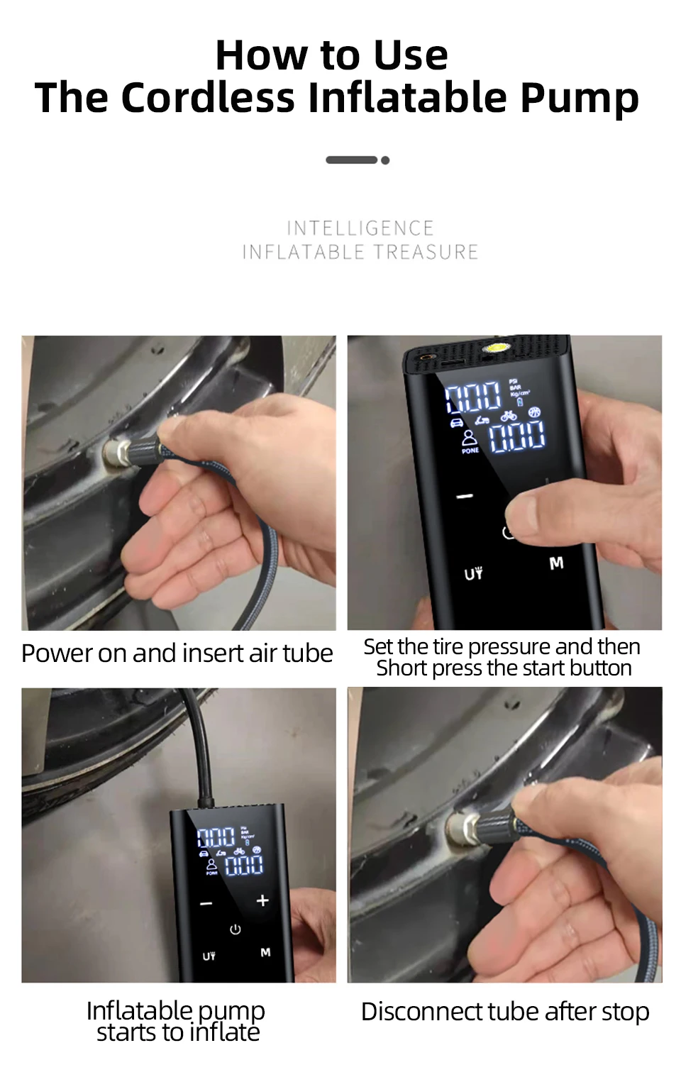 ●Large-capacity rechargeable battery: This portable compressor is equipped with four 2000mAh certified lithium-ion batteries, which can charge bicycles, balls,motorcycle etc. at any time.