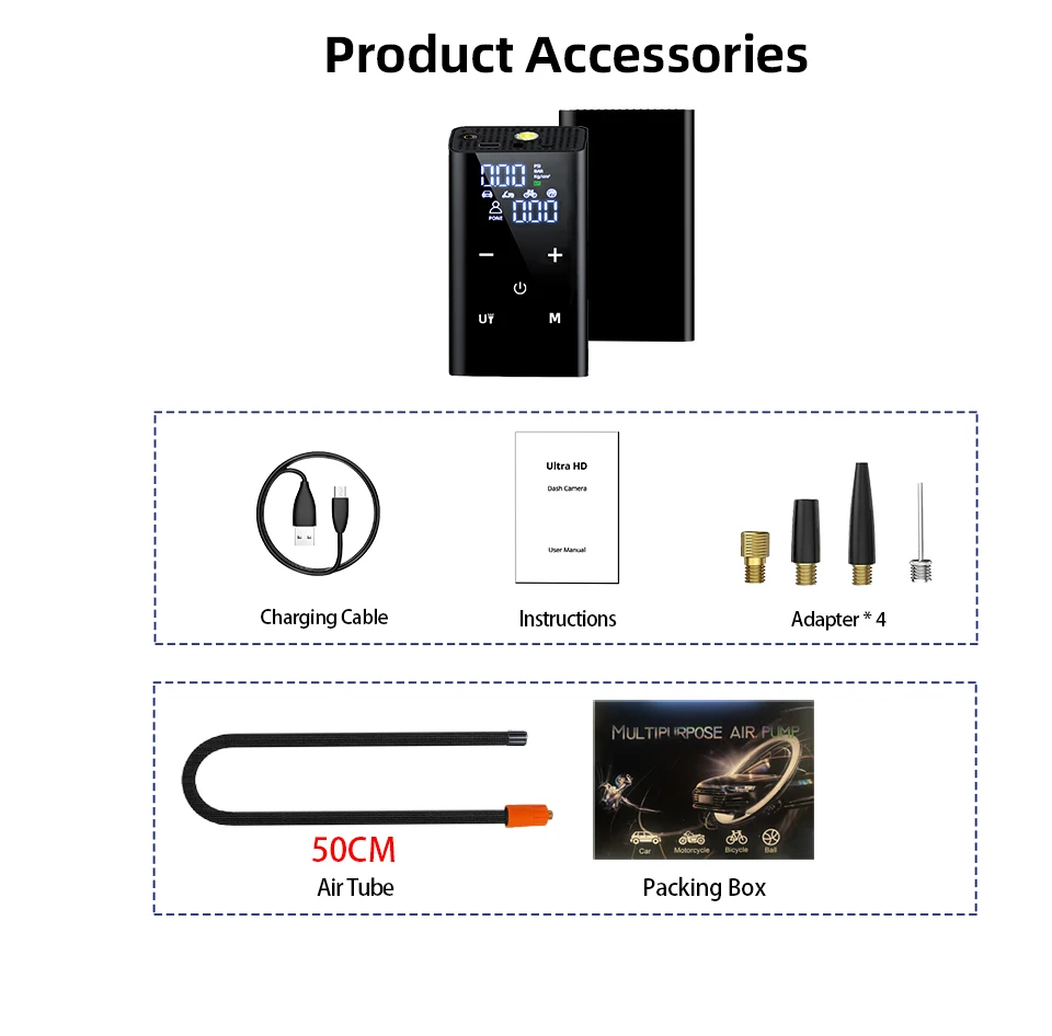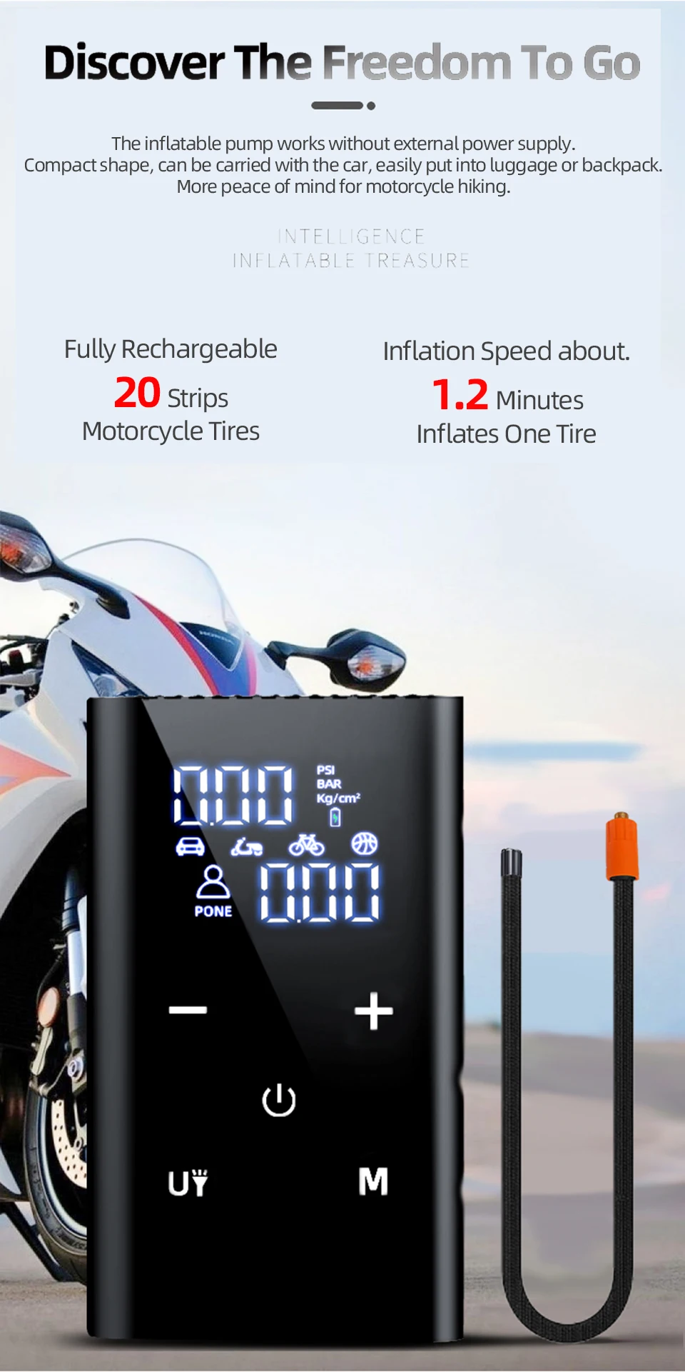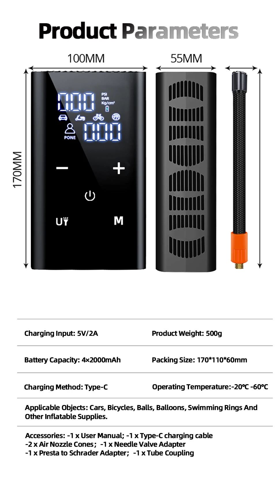 ●Large-capacity rechargeable battery: This portable compressor is equipped with four 2000mAh certified lithium-ion batteries, which can charge bicycles, balls,motorcycle etc. at any time.