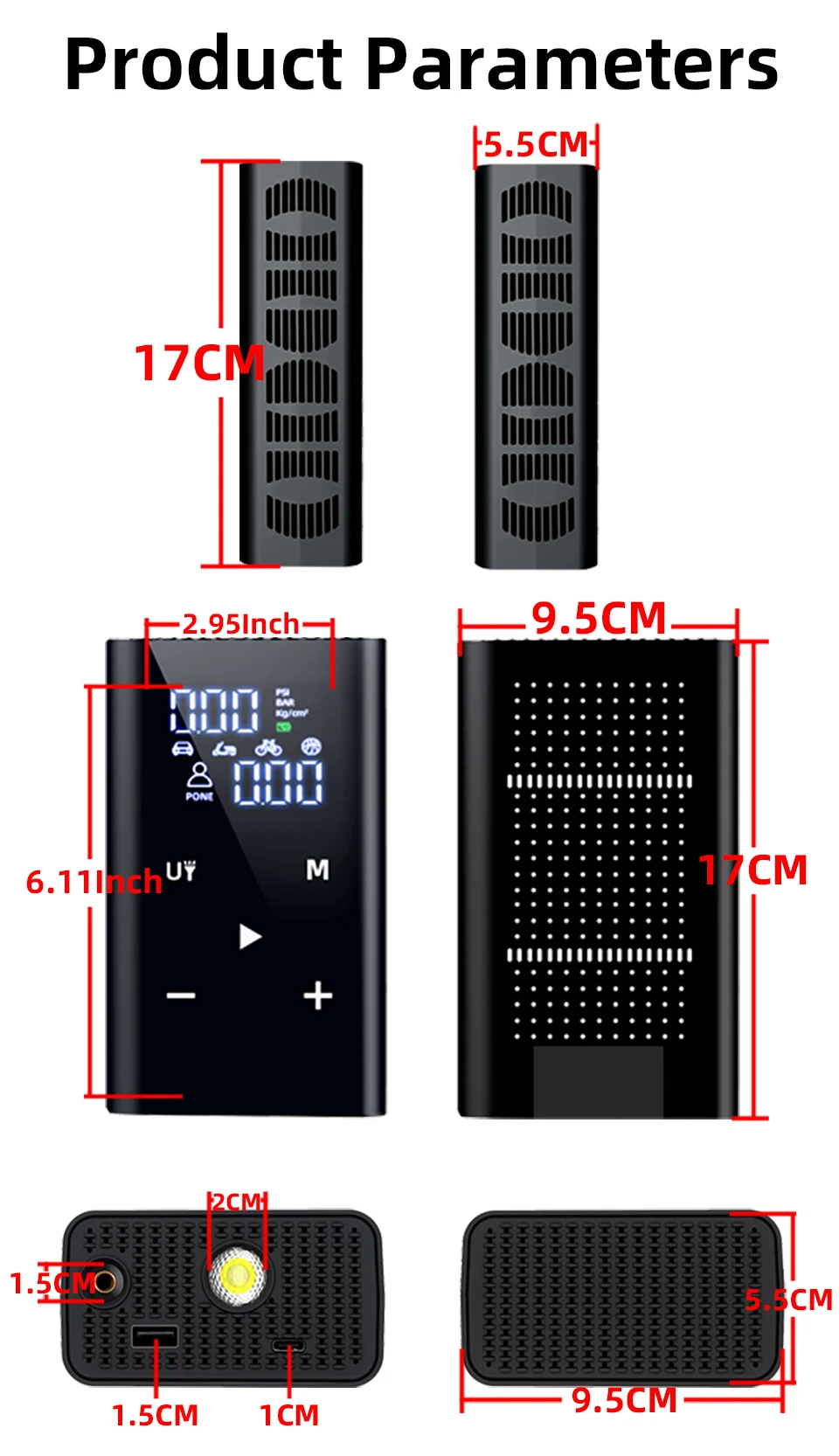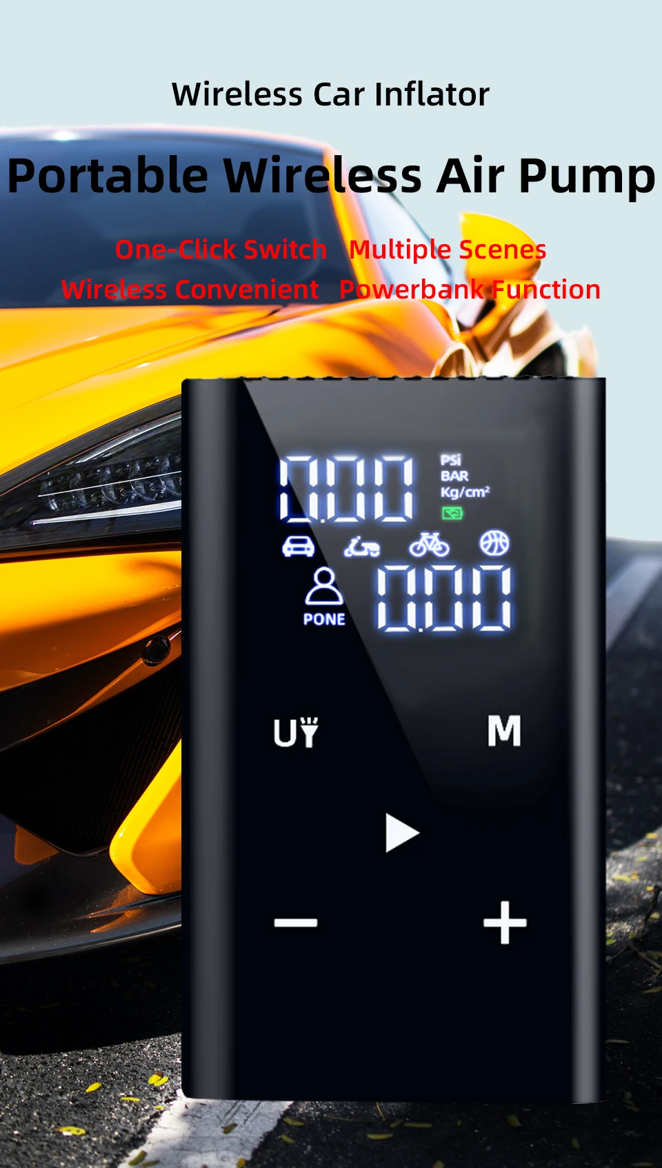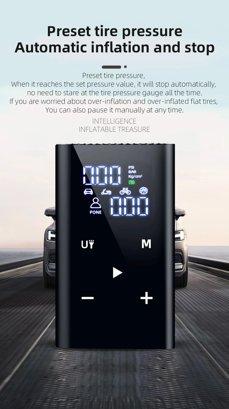 ●Portable and easy to operate: The wireless design and small mini size make the air compressor portable and easy to operate with one hand, weighing only 0.61Kg. Five independent buttons, easy to operate. 5 modes, choose according to the type of inflation you need. The liquid crystal display shows the air pressure, which is very intuitive. It is suitable for inflating tires when the tires are insufficient.