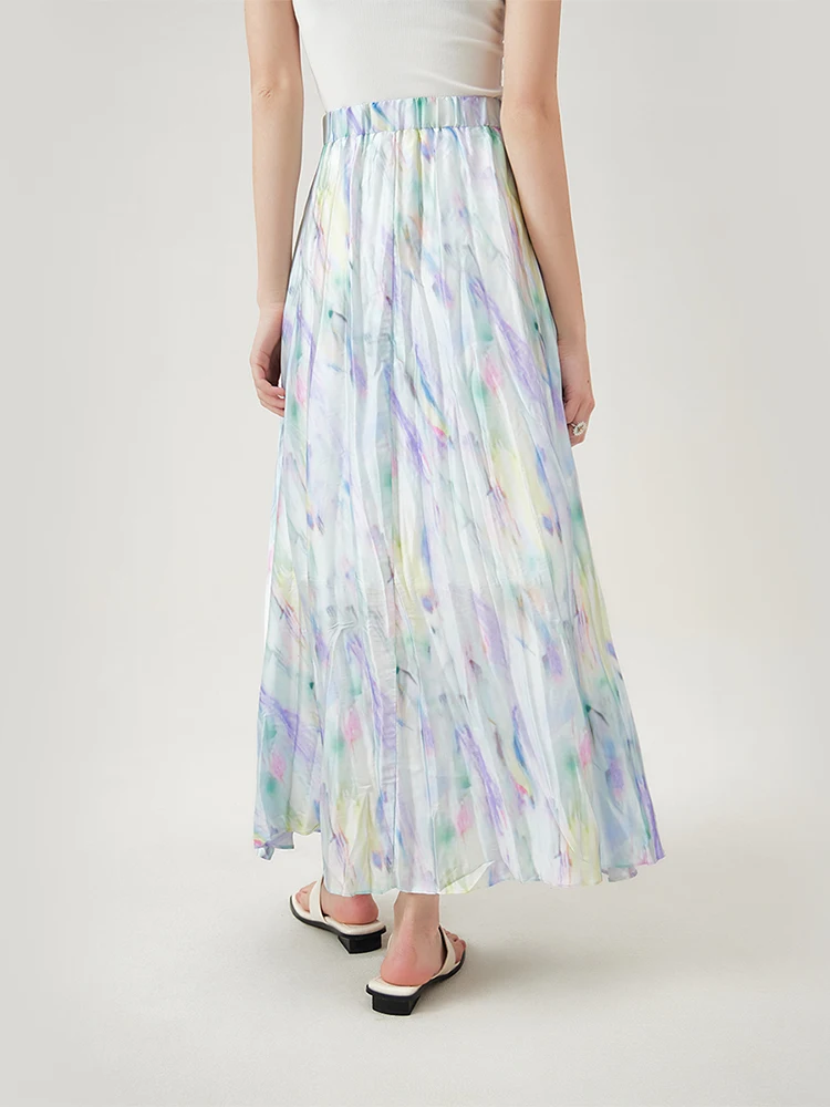 FSLE Long Floral Skirts Elastic Waist High Waist Summer Thin Pleated Ankle-Length Light Blue Women Skirt 24FS12895