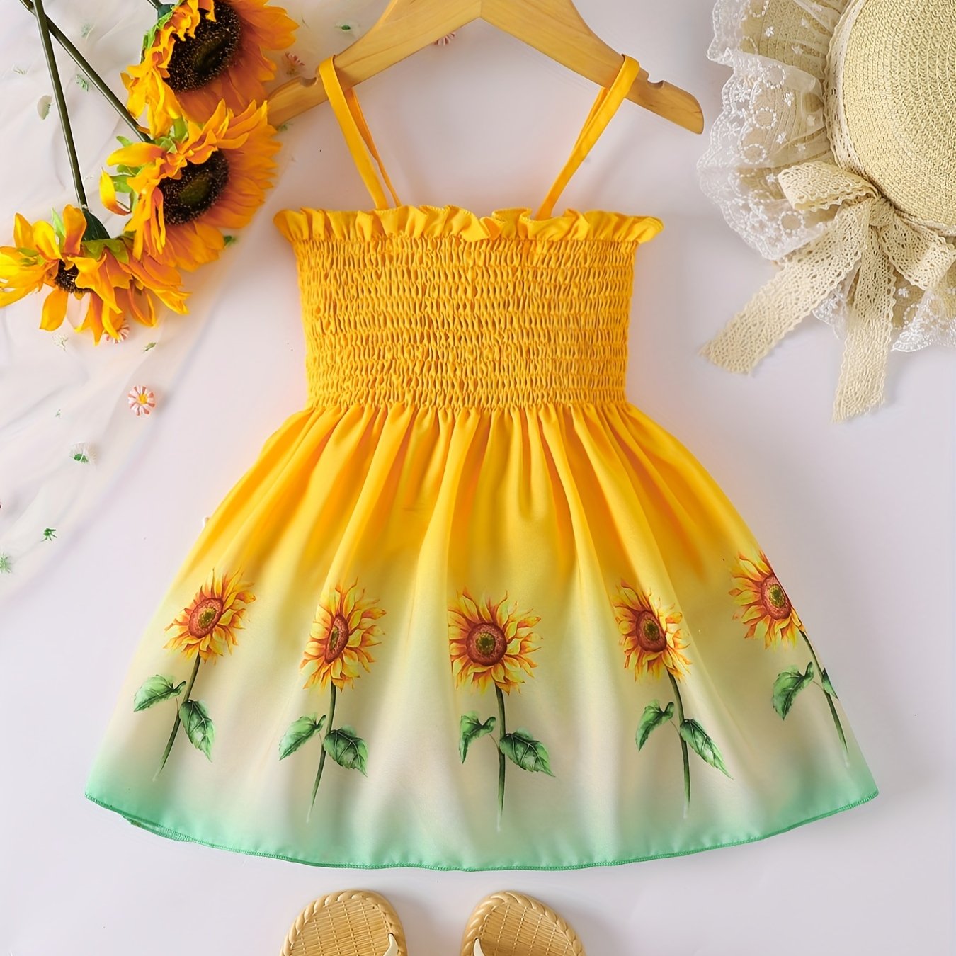 [Sunflower | Girls] Gradient Color Sunflower Princess Dress | Toddler Girls Shirred Cami Frill Trim | For Party Beach Vacation Kids Summer Clothes 4th Of July Outfit