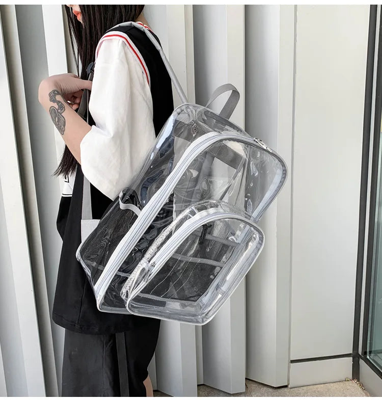 🎒💧 Sleek Meets See-Through Style Say hello to the future of fashion-forward utility with this Transparent Shoulder Backpack—a bold blend of minimalist chic, waterproof design, and multi-compartment smarts. Whether you’re headed to school, a festival, or a city commute, this bag is built to show off your vibe while keeping your essentials dry and within easy view.