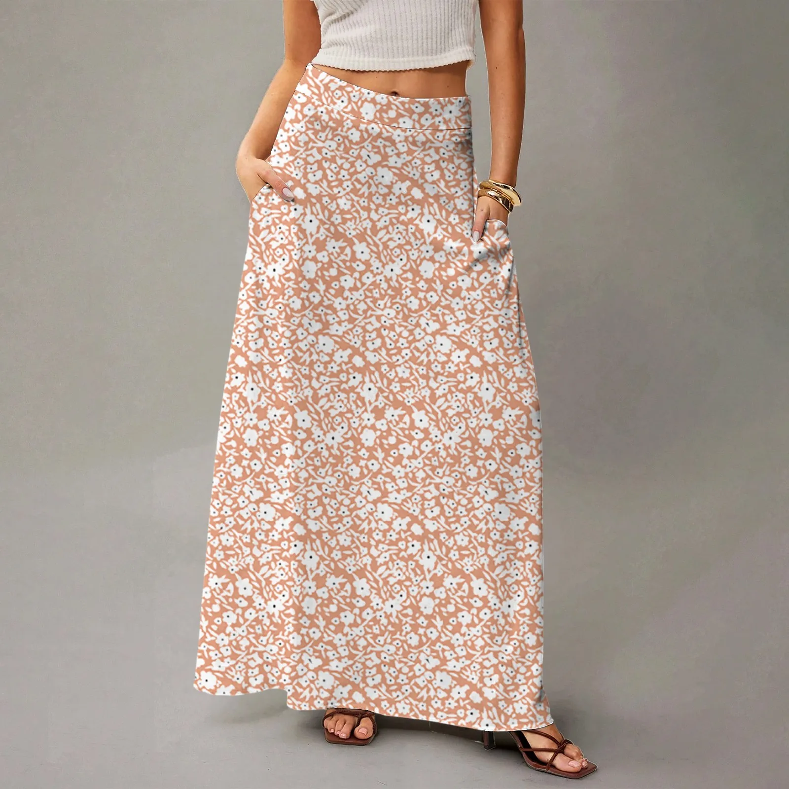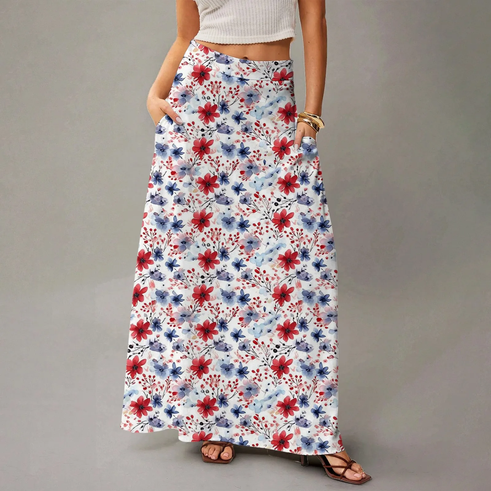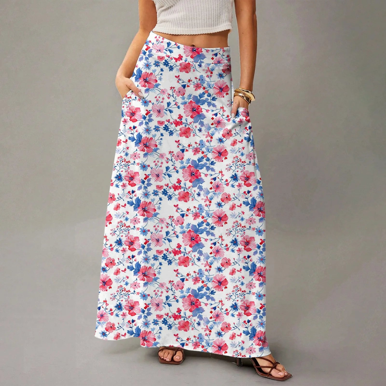 Women's Straight Skirt Casual Summer Floral Print Bohemian Skirt Flowing Maxi Skirts with pockets High waist Elastic skirt
